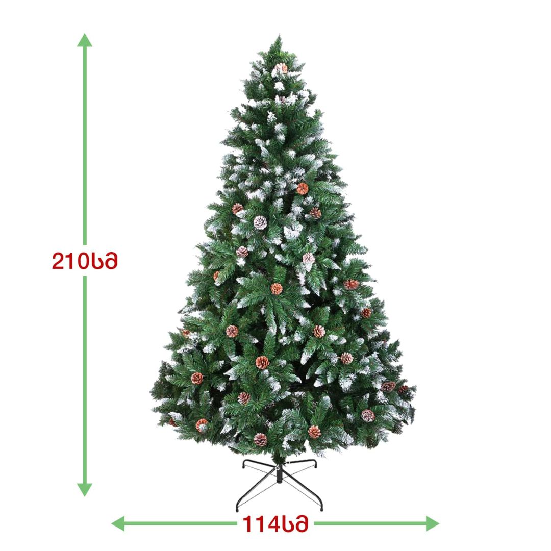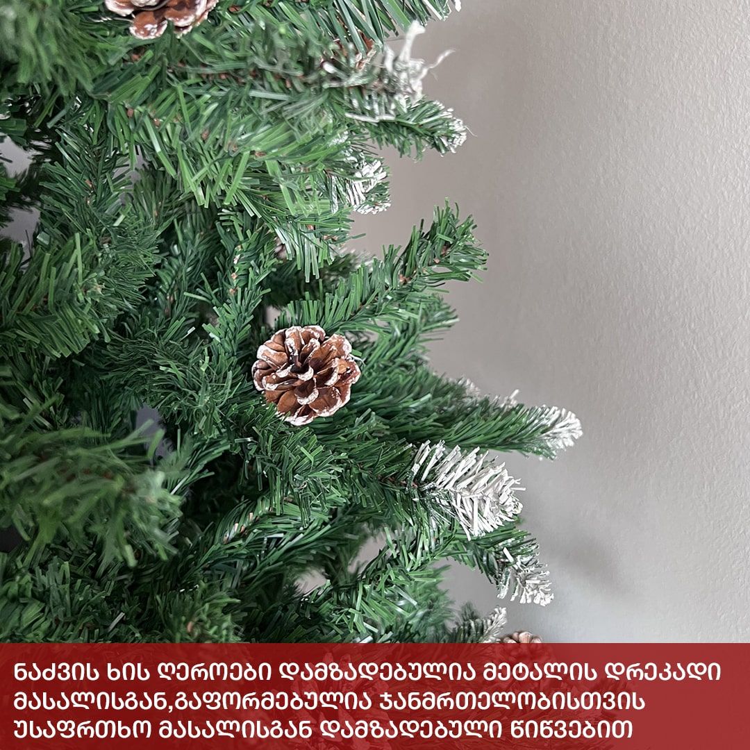- "ნაძვის ხე დათოვლილი ბოლოებით, გაფორმებული გირჩებით. გამძლე დრეკადი მეტალის ტოტებით და ჯანმრთელობისთვის უსაფრთხო მასალისგან დამზადებული წიწვებით. მეტალის მყარი სადგამით და მთავარი ღერძით. "