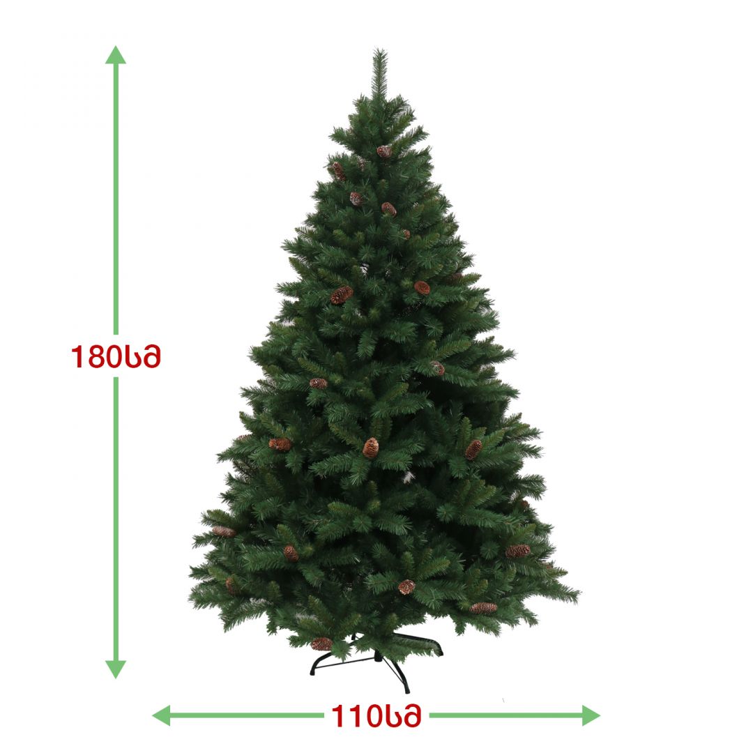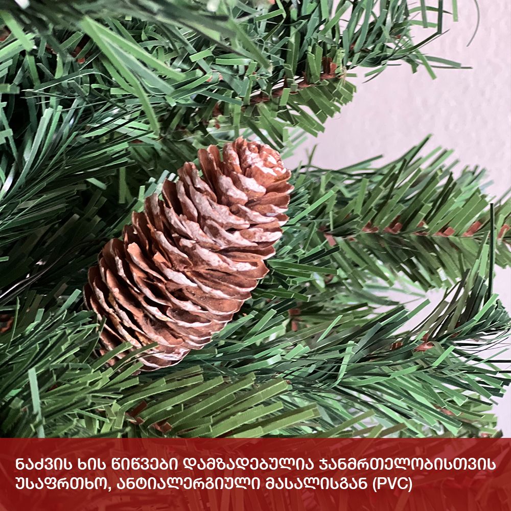 - ნაძვის ხე, გაფორმებული გრძელი გირჩებით. გამძლე დრეკადი მეტალის ტოტებით და ჯანმრთელობისთვის უსაფრთხო მასალისგან დამზადებული წიწვებით. მეტალის მყარი სადგამით და მთავარი ღერძით