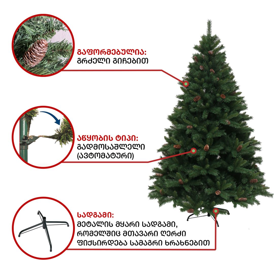 - ნაძვის ხე, გაფორმებული გრძელი გირჩებით. გამძლე დრეკადი მეტალის ტოტებით და ჯანმრთელობისთვის უსაფრთხო მასალისგან დამზადებული წიწვებით. მეტალის მყარი სადგამით და მთავარი ღერძით.