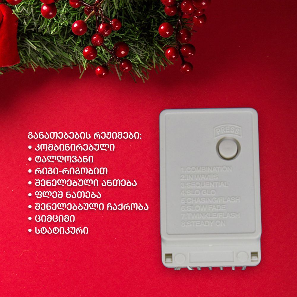 - "უსაფრთხო და საიმედო საახალწლო განათება განკუთვნილია ნაძვის ხის, კედლების, ფანჯრების და ნებისმიერი გარემოს გასანათებლად. განათება მოიხმარს დაბალ ენერგიას, ამიტომაც შეგიძლიათ ეკონომია არ გააკეთოთ მასზე და საახალწლო პერიოდში შეუზღუდავად აიმაღლოთ განწყობა. გამოსაყენებლად ძალიან მარტივი და პრაქტიკულია, მხოლოდ ერთი ღილაკი აქვს, რომლის საშუალებითაც შეცვლით ნათების რეჟიმს. *განათების კაბელი წყალგამძლეა, მაგრამ მაკონტროლებელი არა. ამიტომ გარეთ გამოყენებამდე შეფუთეთ მაკონტროლებელი აუცილებლად. "
