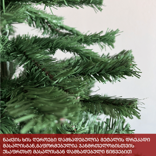 - ნაძვის ხე გამძლე დრეკადი მეტალის ტოტებით და ჯანმრთელობისთვის უსაფრთხო მასალისგან დამზადებული წიწვებით. მეტალის მყარი სადგამით და მთავარი ღერძით.