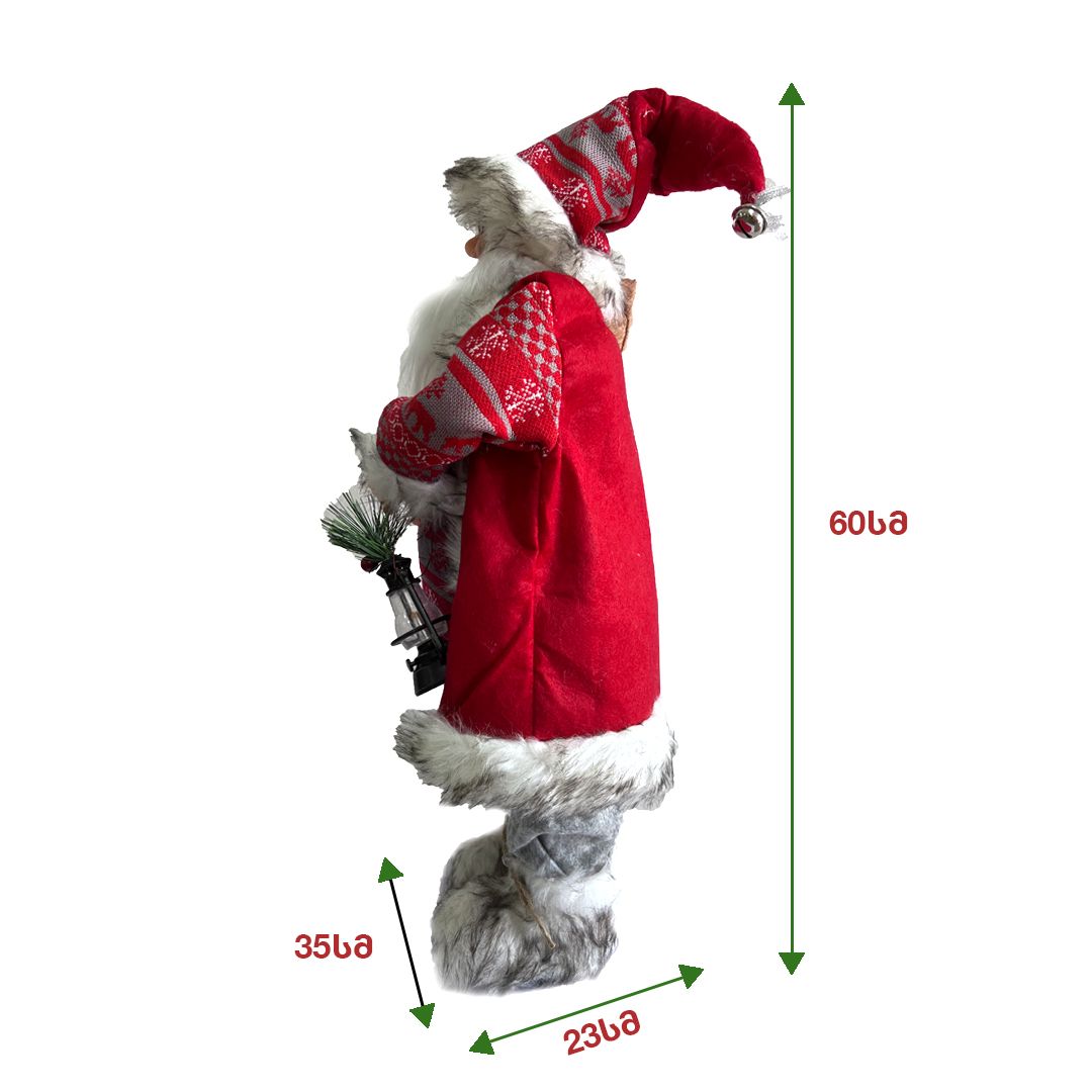 - 60 სმ სიმაღლის სანტა კლაუსი, წითელ კოსტუმში. თეთრი ჩექმებით და ნაცრისფერი შარვლით. გაფორმებული დეკორაციებით: ზურგზე გადაკიდებული ხურჯინი და ხელში ლამპარი.