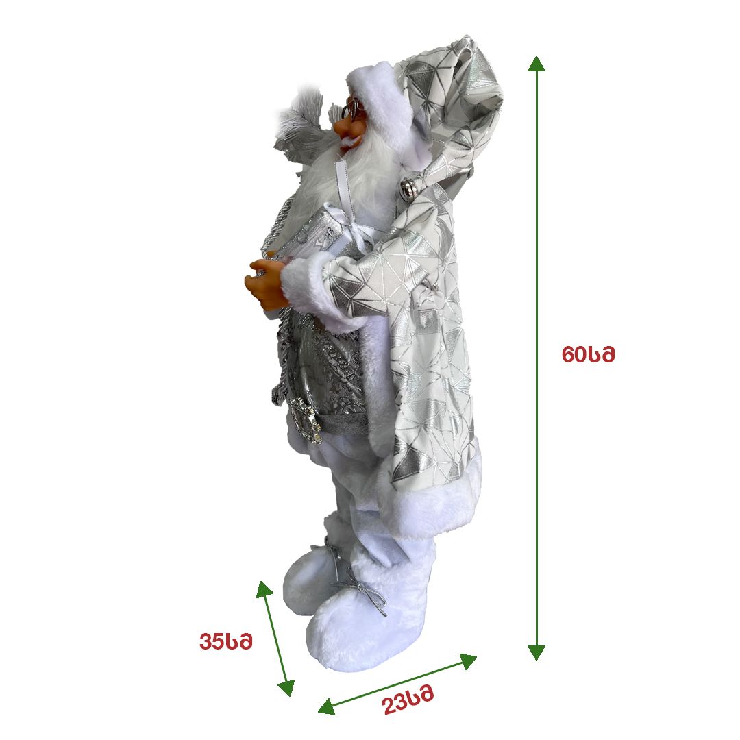 - 60 სმ სიმაღლის სანტა კლაუსი, ვერცხლისფერ კოსტუმში გაფორმებული დეკორაციებით: ზურგზე გადაკიდებული ხურჯინი და ხელში საჩუქრით.