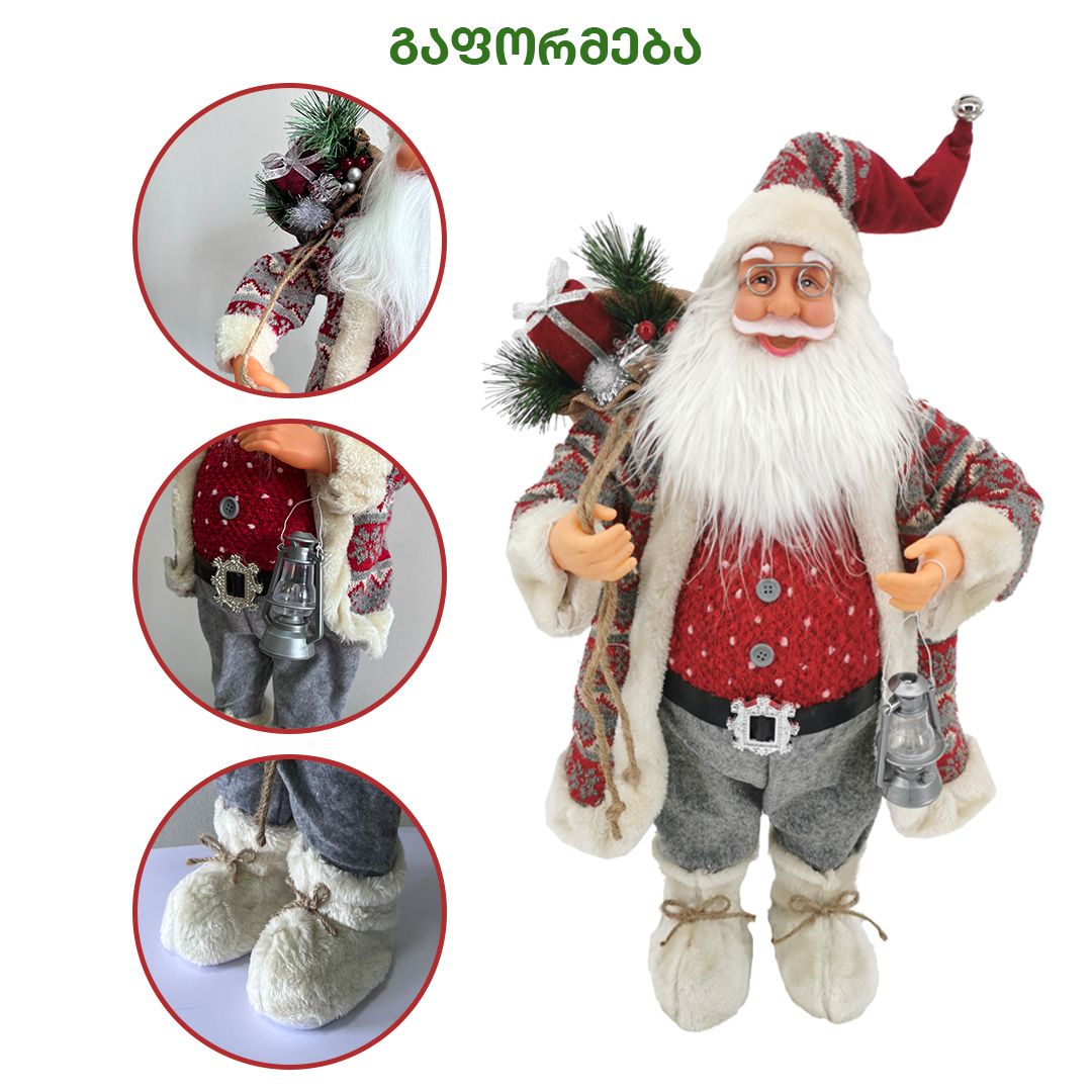 - 60 სმ სიმაღლის სანტა კლაუსი, ფიფქის პრინტიან კოსტუმში. თეთრი ჩექმებით და ნაცრისფერი შარვლით. გაფორმებული დეკორაციებით: ზურგზე გადაკიდებული ხურჯინი და ხელში ლამპარი.