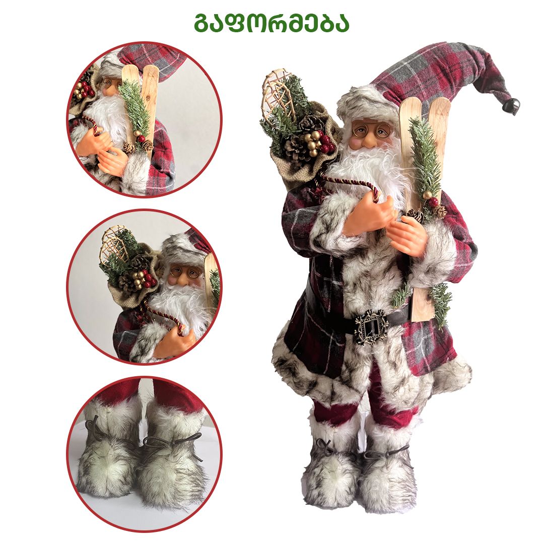 - 60 სმ სიმაღლის სანტა კლაუსი, კუბოკრულ კოსტუმში გაფორმებული დეკორაციებით: ზურგზე გადაკიდებული ხურჯინი და ხელში თხილამურებით.